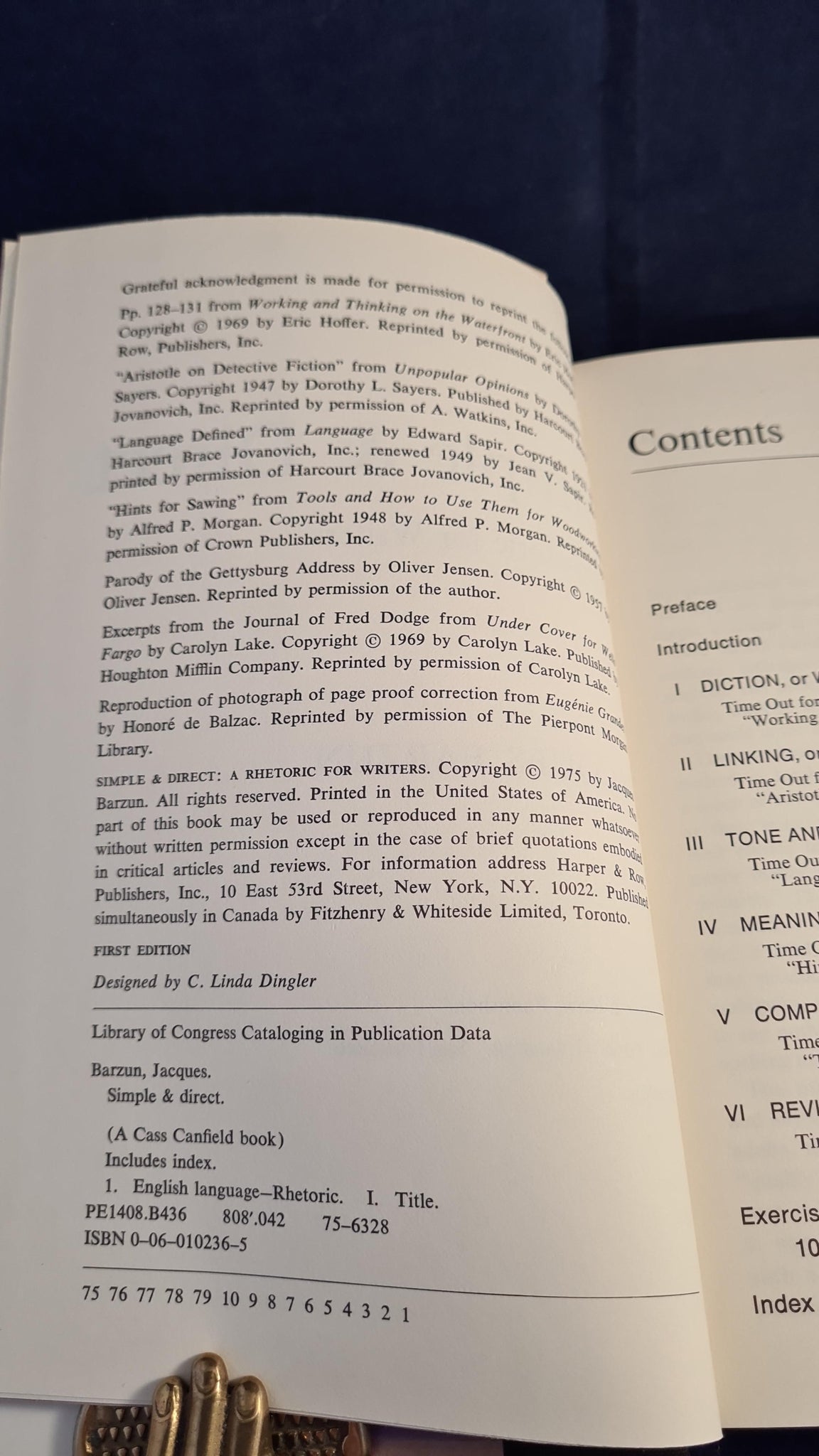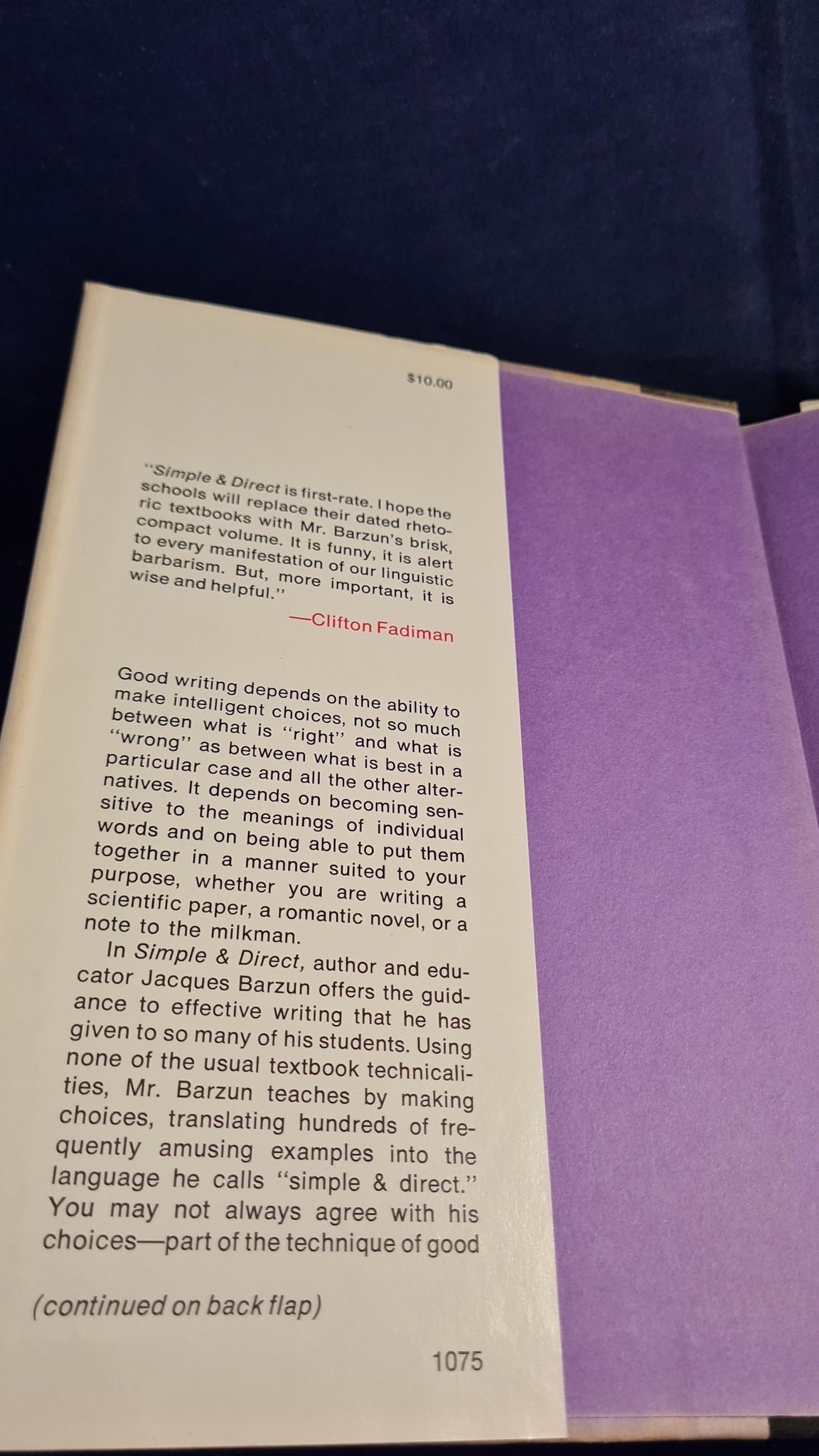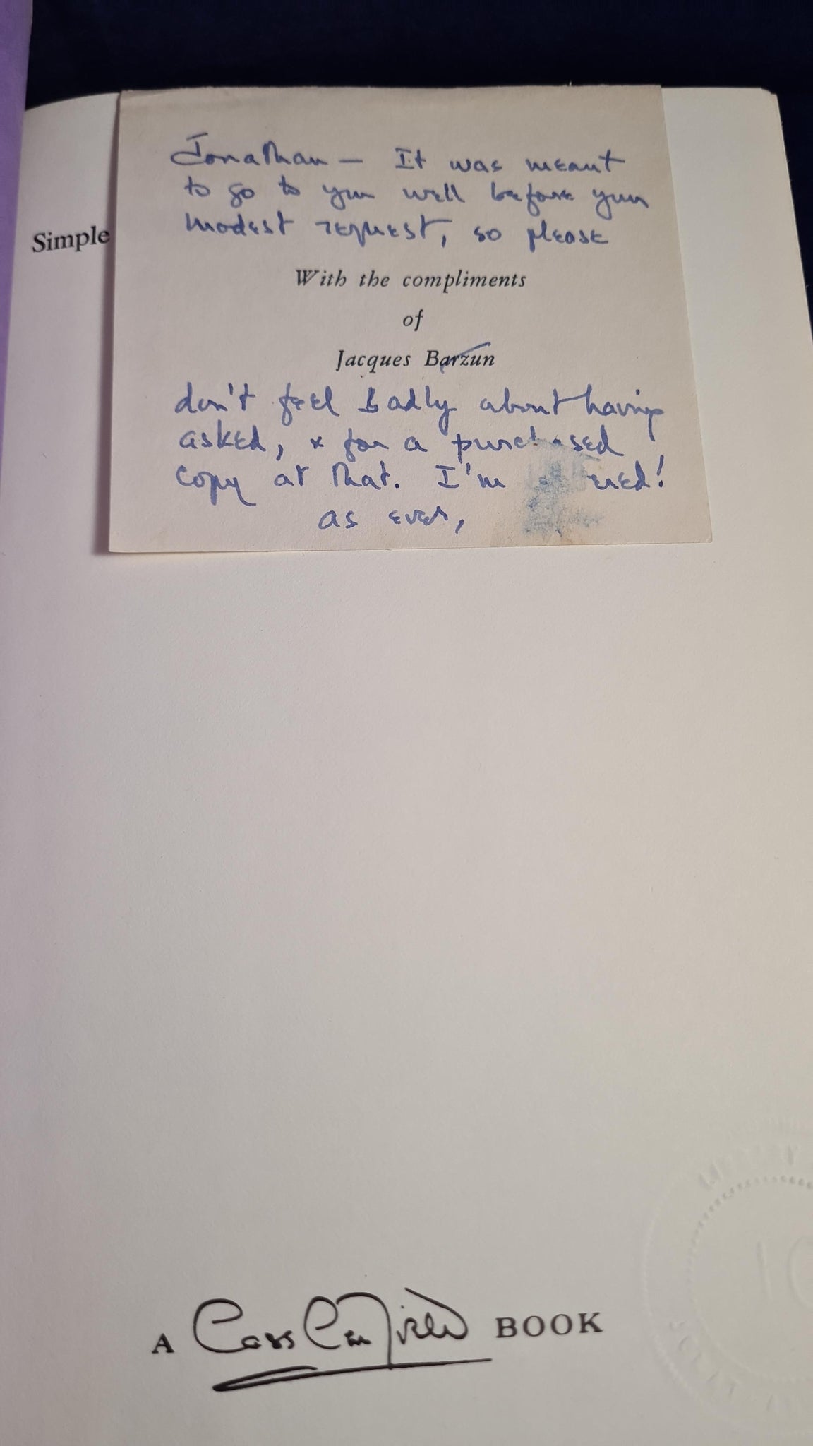Jacques Barzun - Simple & Direct, Harper & Row, 1975, First Edition, Compliment Slip