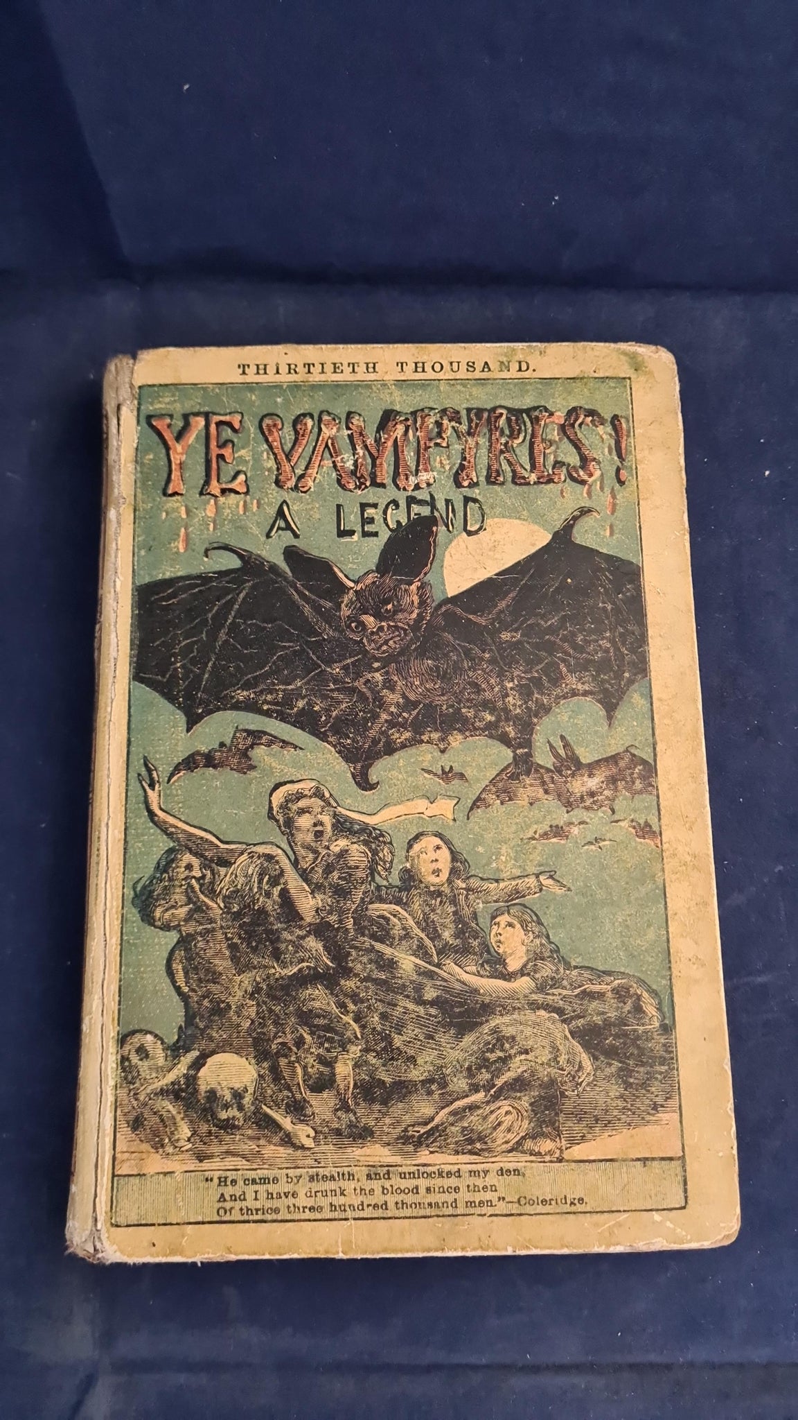 "Ye Vampyres" by "The Spectre" is a Victorian-era allegorical novel titled, "Ye Vampyres: A Legend of the National Betting-Ring, Showing What Became of It."  The book is a gothic fantasy that uses the metaphor of vampires to critique the corruption of the British stock market in a far-future setting, narrated by an ancient, time-traveling specter.