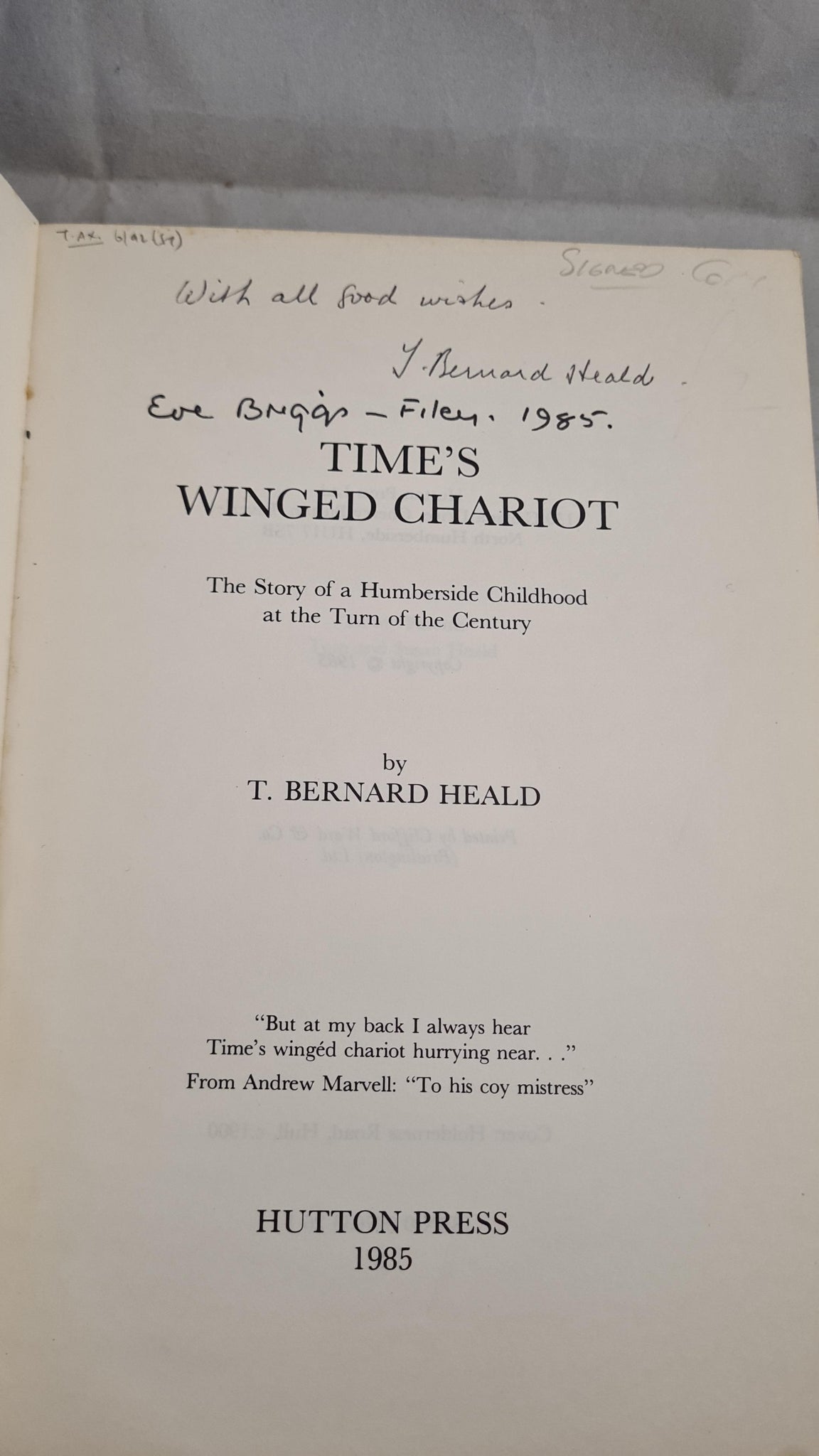 T Bernard Heald - Time's Winged Chariot, Hutton Press, 1985, First Edition, Signed