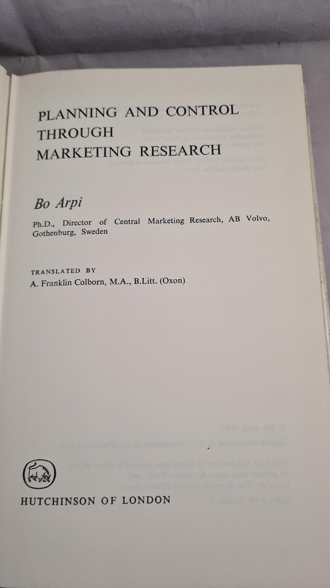 Bo Arpi - Planning and Control Through Marketing Research, Hutchinson, 1973