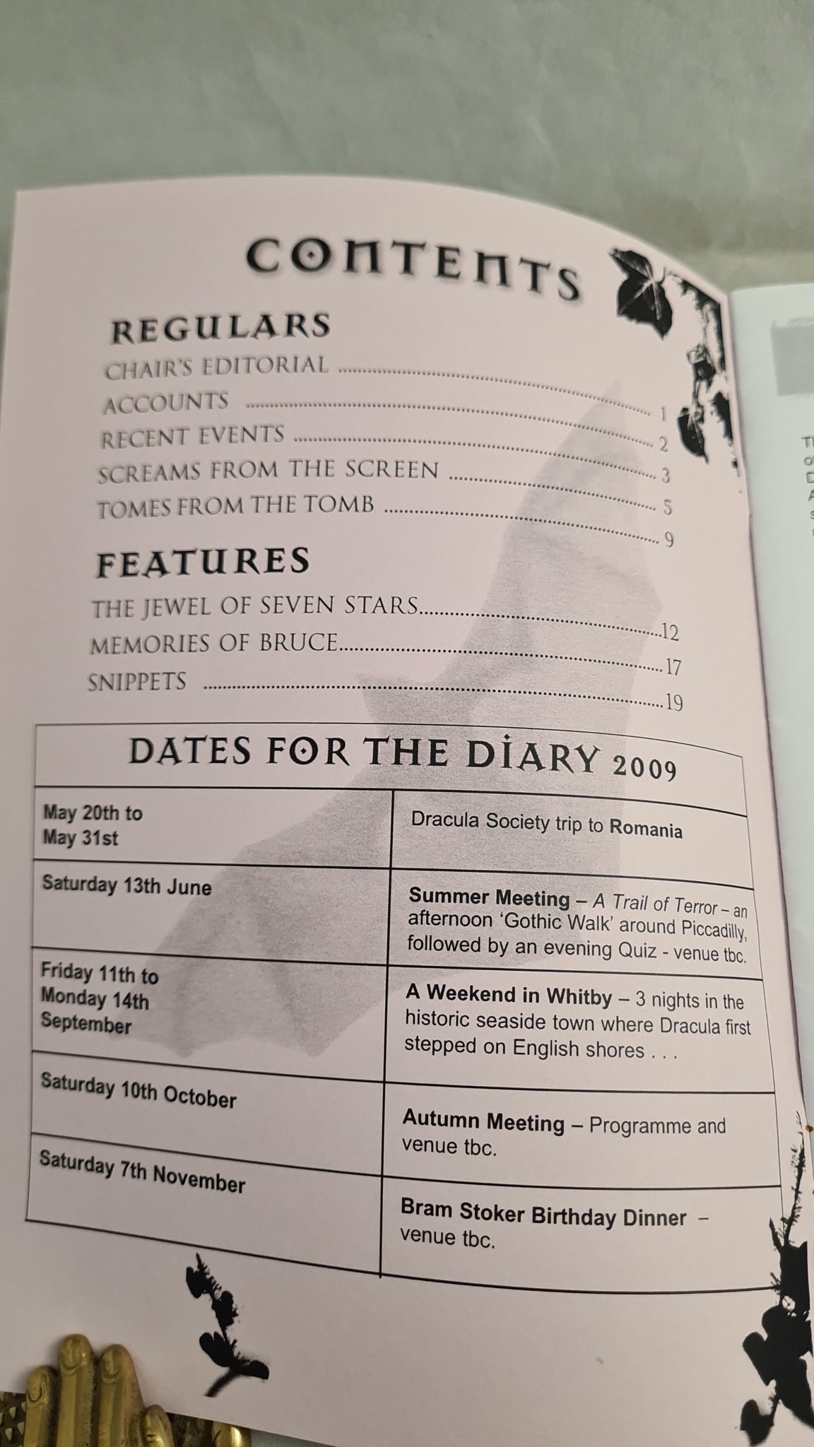 Society Updates: It features reports on Society events and meetings, as well as announcements for future gatherings like the annual Bram Stoker Birthday Dinner. Reviews and Articles: Members contribute reviews of books, films, and theatre productions. Feature articles explore various aspects of the Gothic and supernatural genres. Photography: Issues often include photographs taken by members during Society trips and events. Submissions: The publication is specifically for Society members; it does not accept external submissions or publish original fiction.