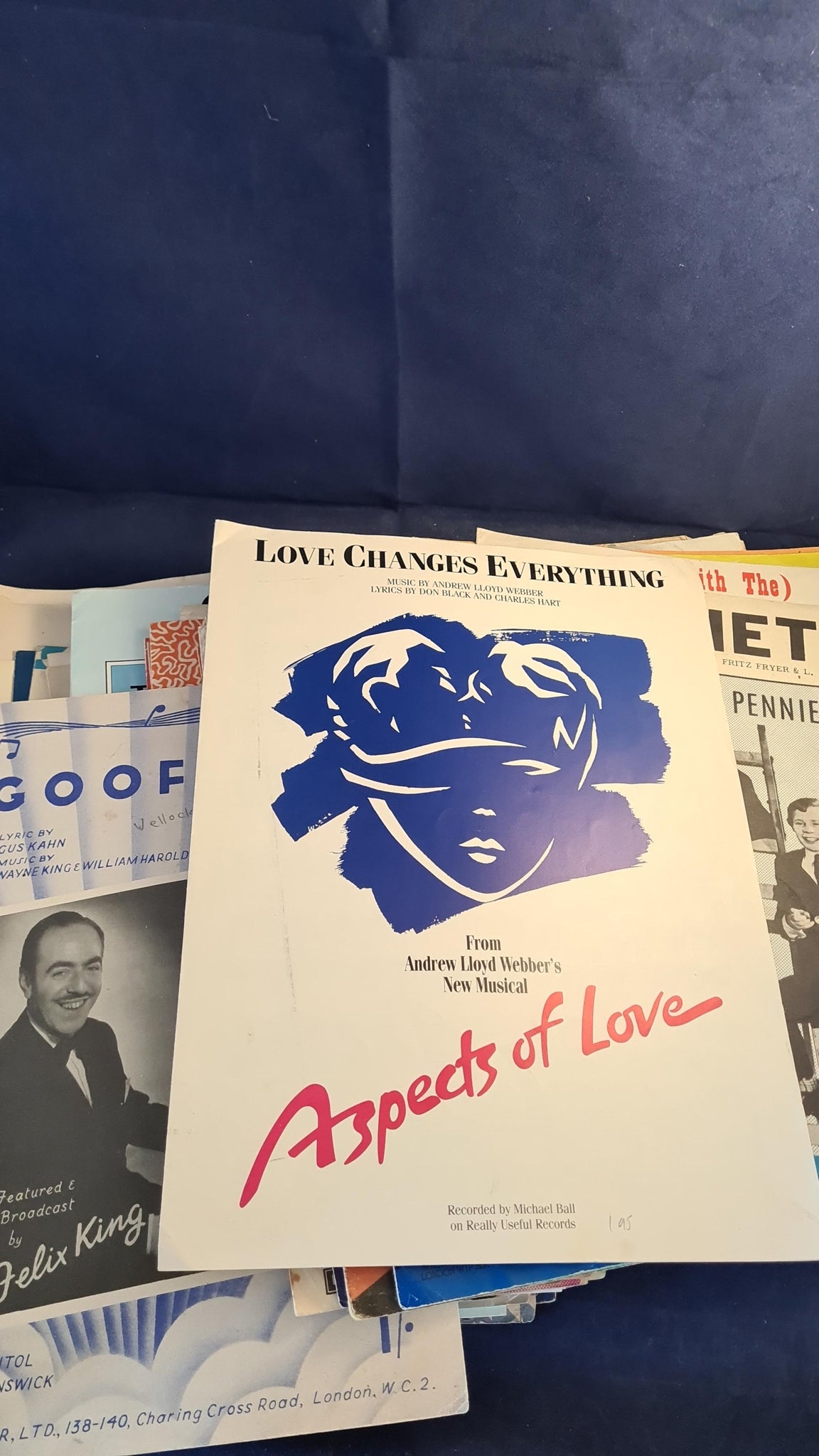 An interesting and large collection of vintage music sheets from Musicals, Theatres, Singer's etc over many years.  Stains to some copies, bumped edges and corners.