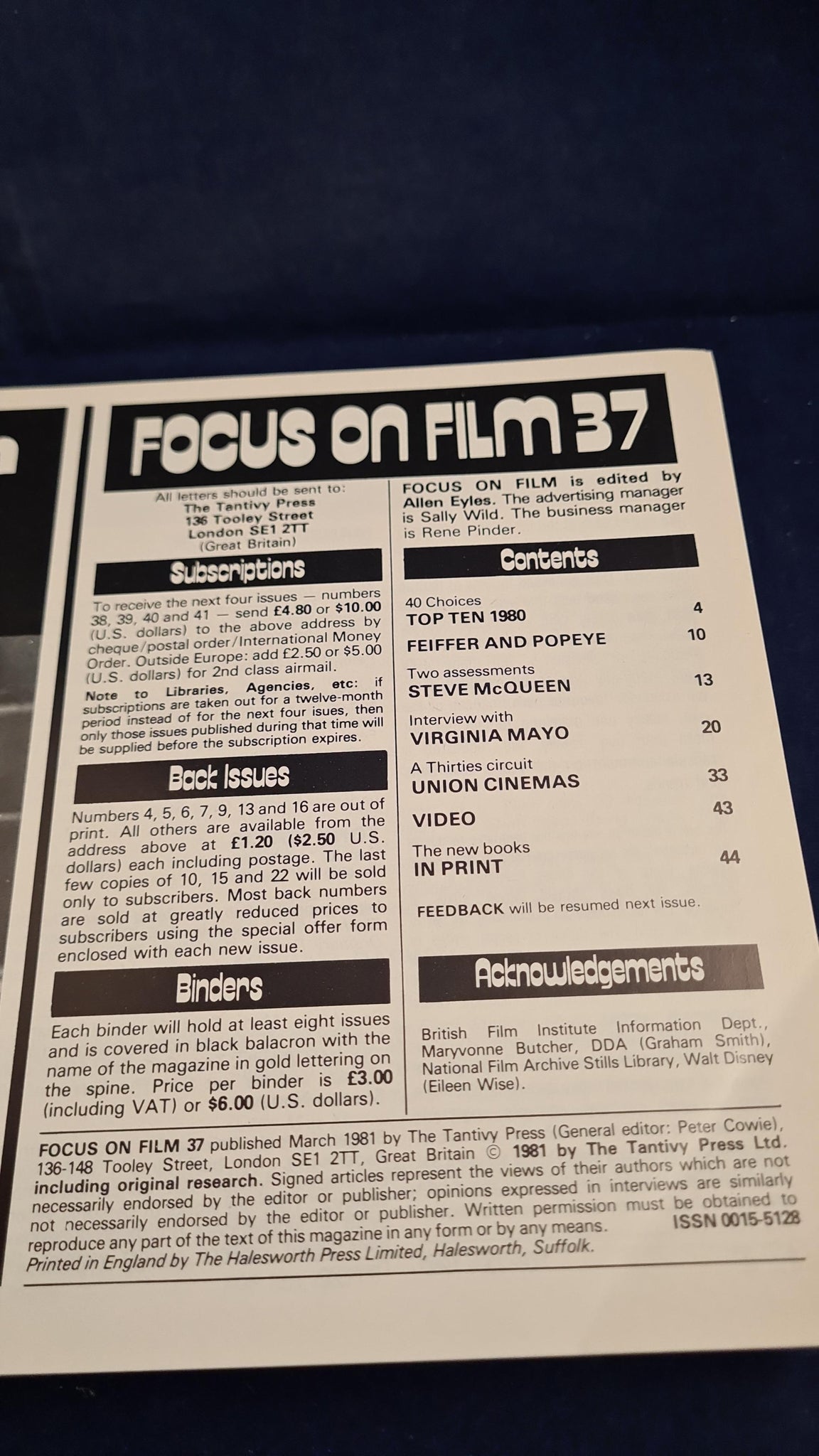 Focus on Film Magazine, Number 37, March 1981, Tantivy Press