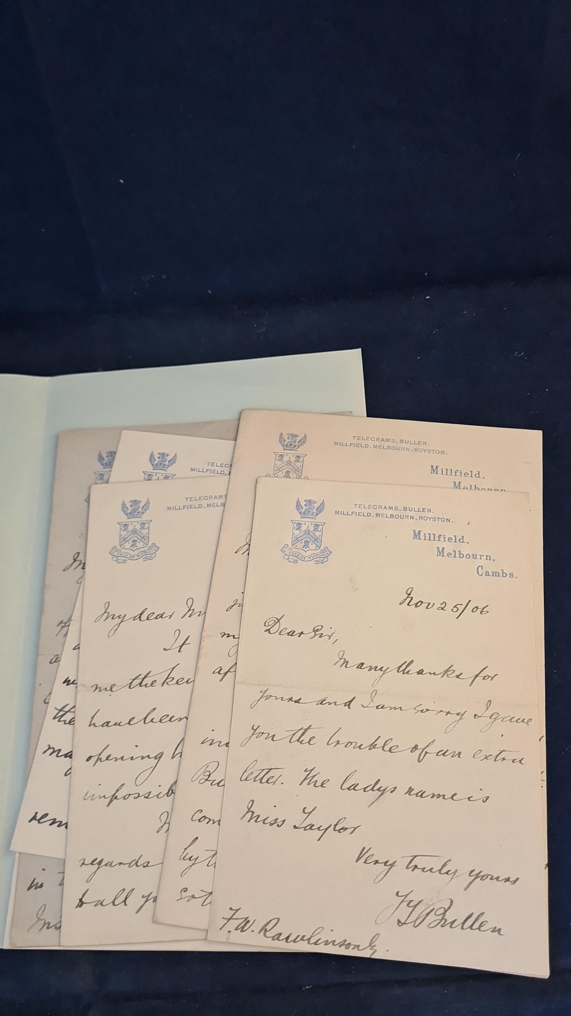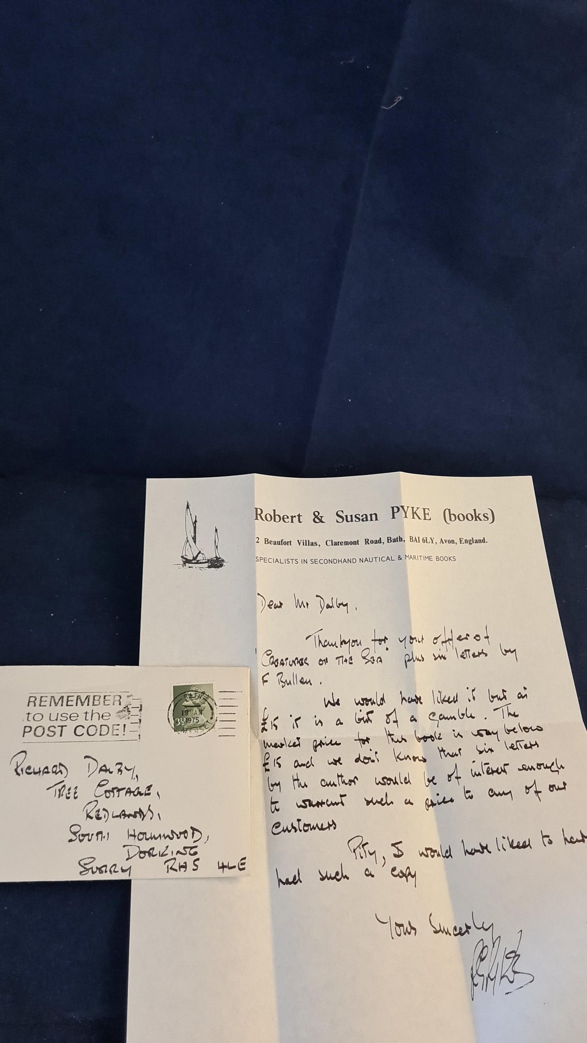 Correspondence between Mr Rawlinson and Frank Thomas Bullen in a folder. Also, a letter to Richard Dalby from Robert & Susan Pyke (books) for the sale of this book and 6 signed letters.