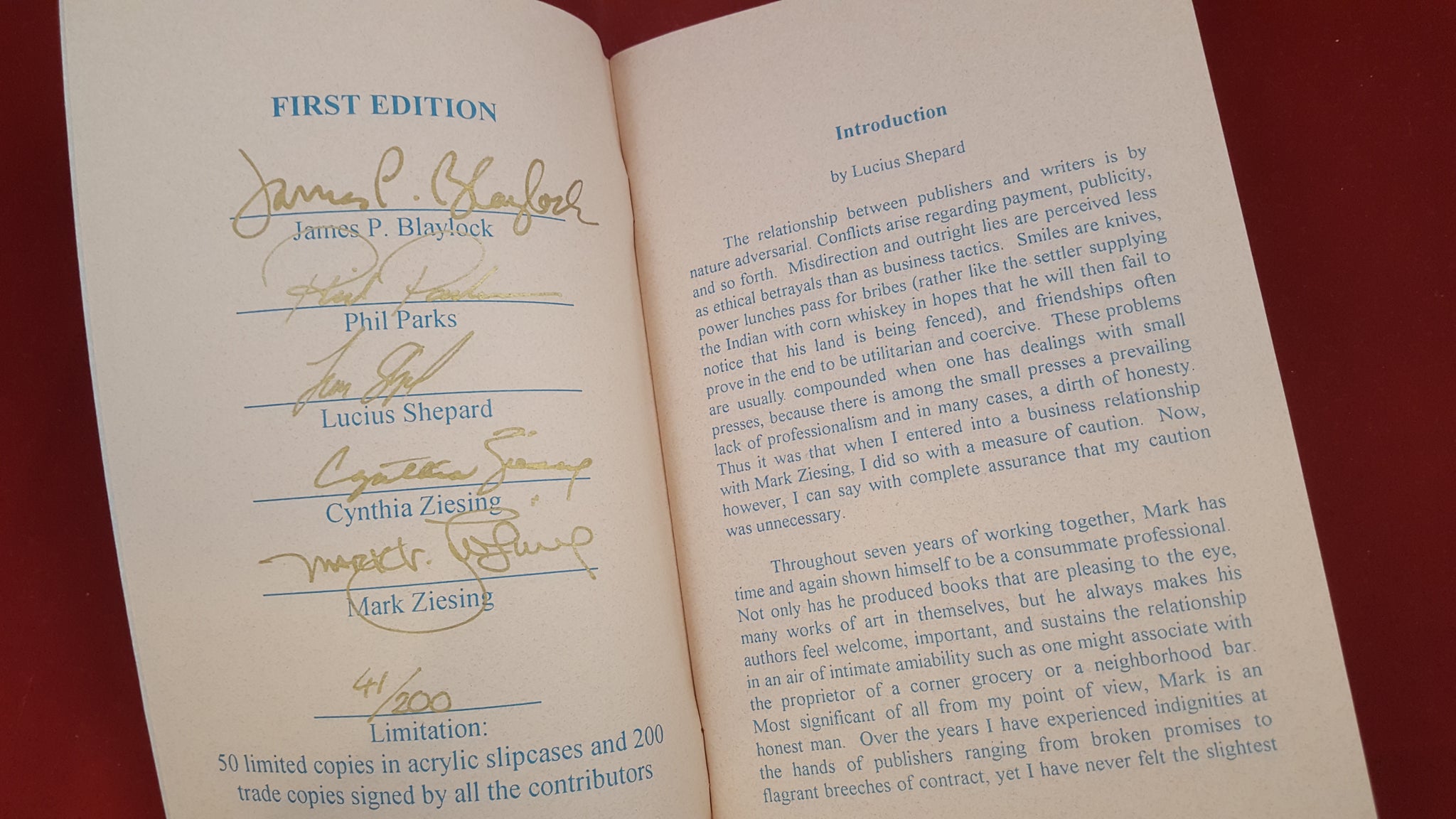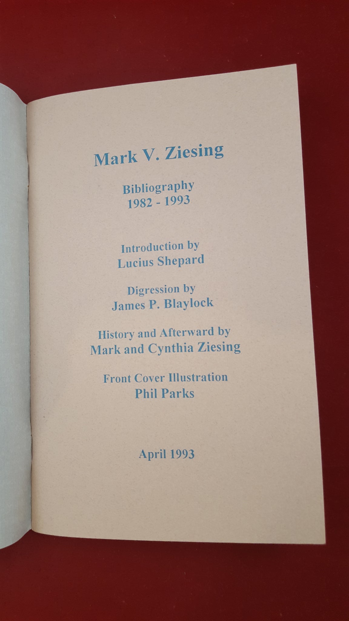 First edition catalogue style bibliography of the Mark V. Ziesing collection between the years 1982 - 1993. Number 41 of 200 trade copies signed by James P. Blaylock, Phil Parks, Lucius Shepard, Cynthia Ziesing and Mark Zeising.