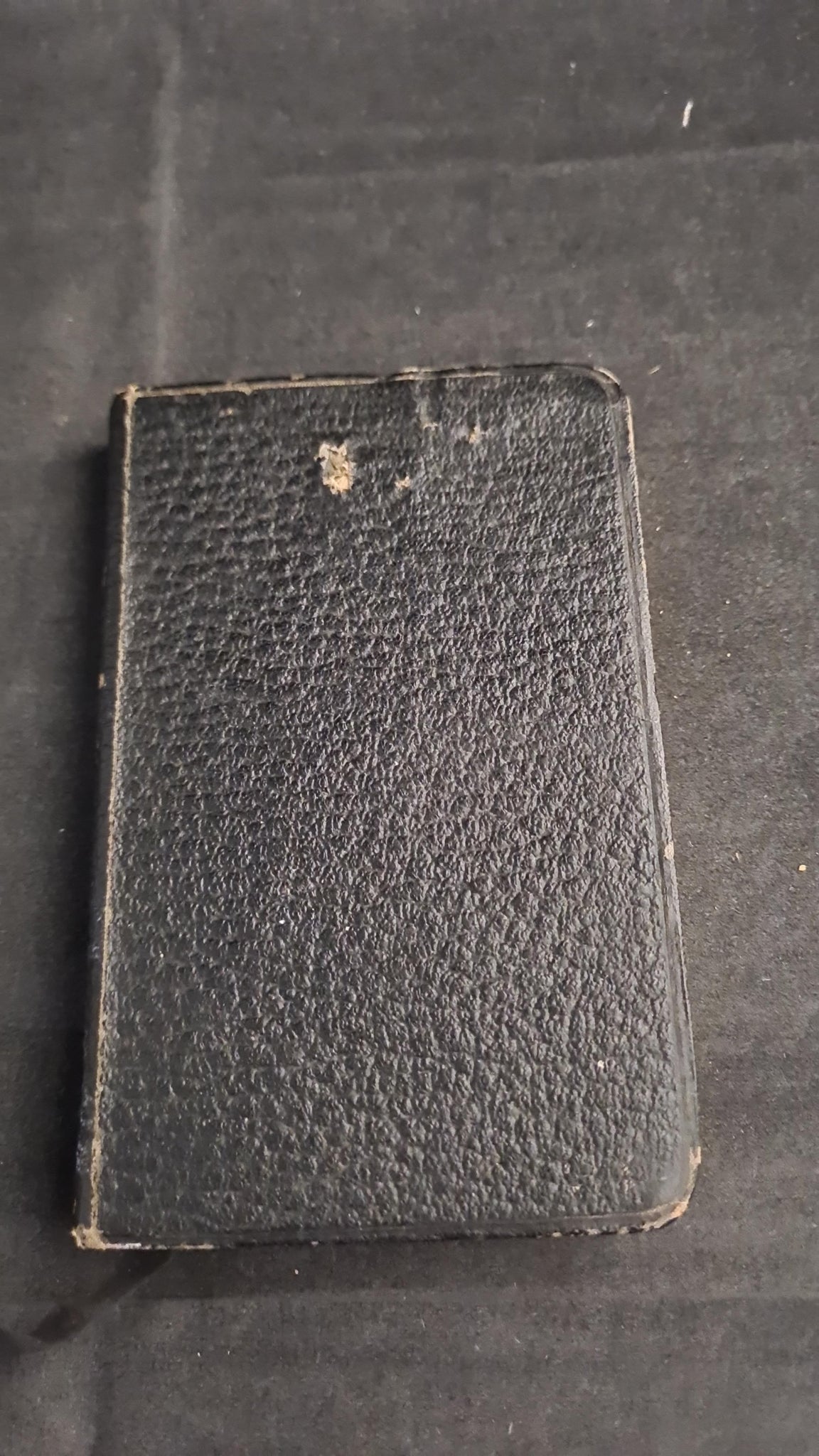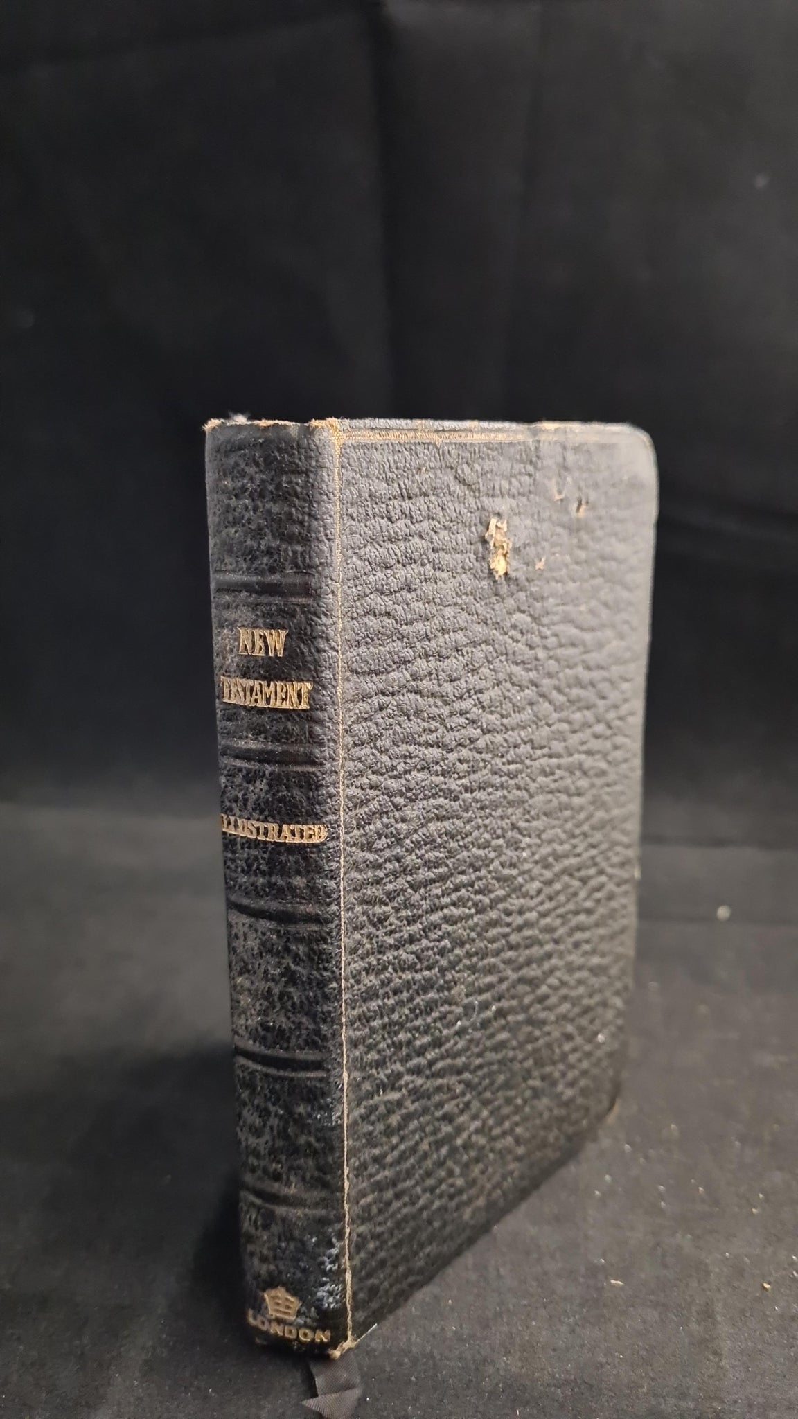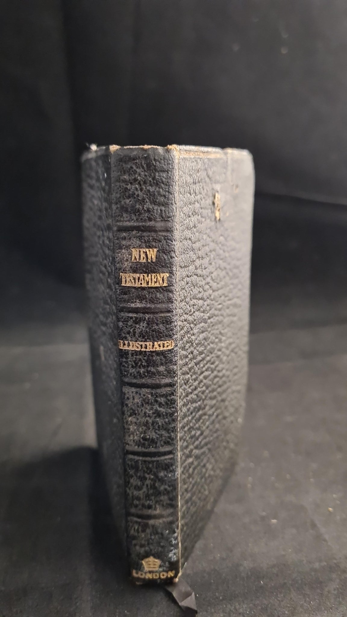 Pocket size New Testament in fair condition. Damage to top edge of front cloth and torn endpaper. Gilt page edges. Gilt lettering to spine. Illustrated. Text firm and clean.