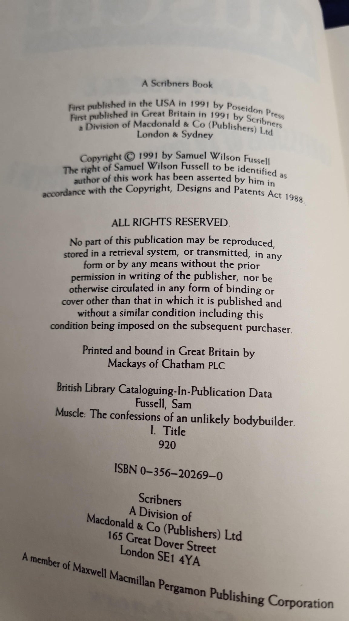 Sam Fussell - Muscle, Confessions of An Unlikely Bodybuilder, Scribners, 1991, First GB Edition