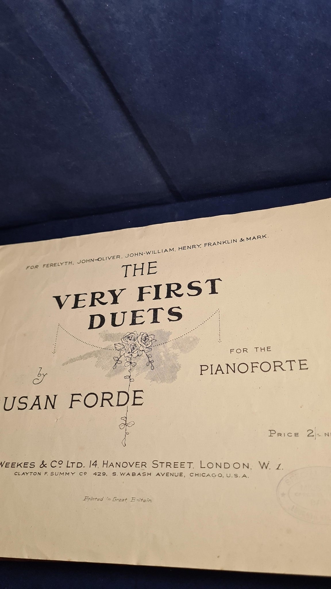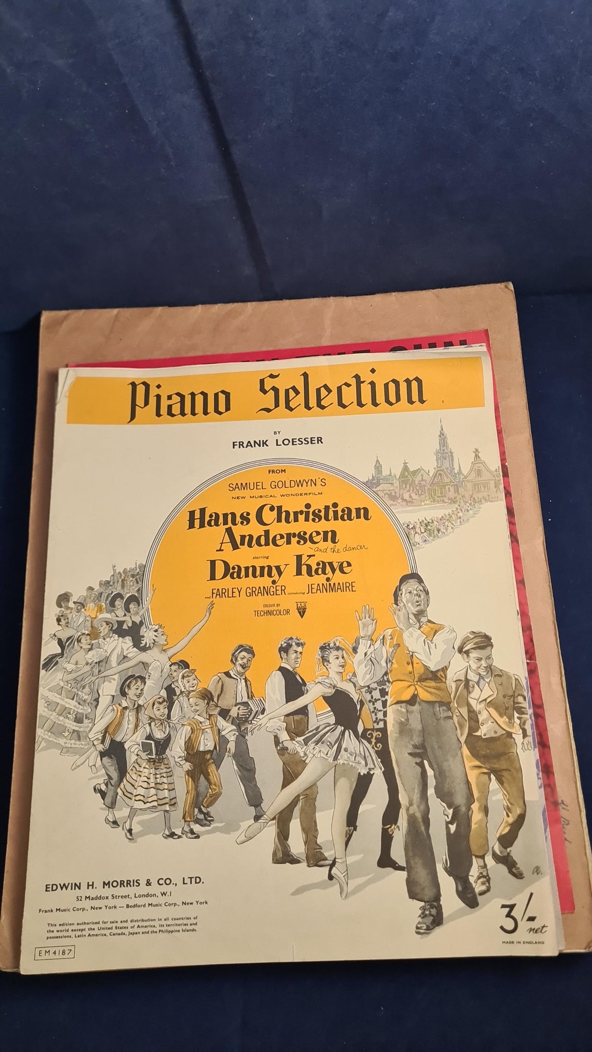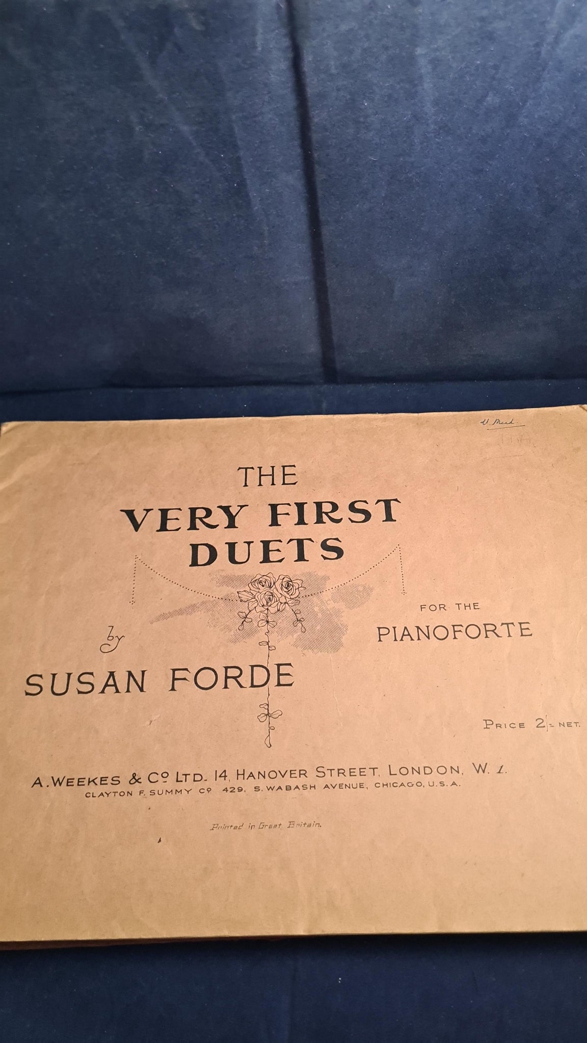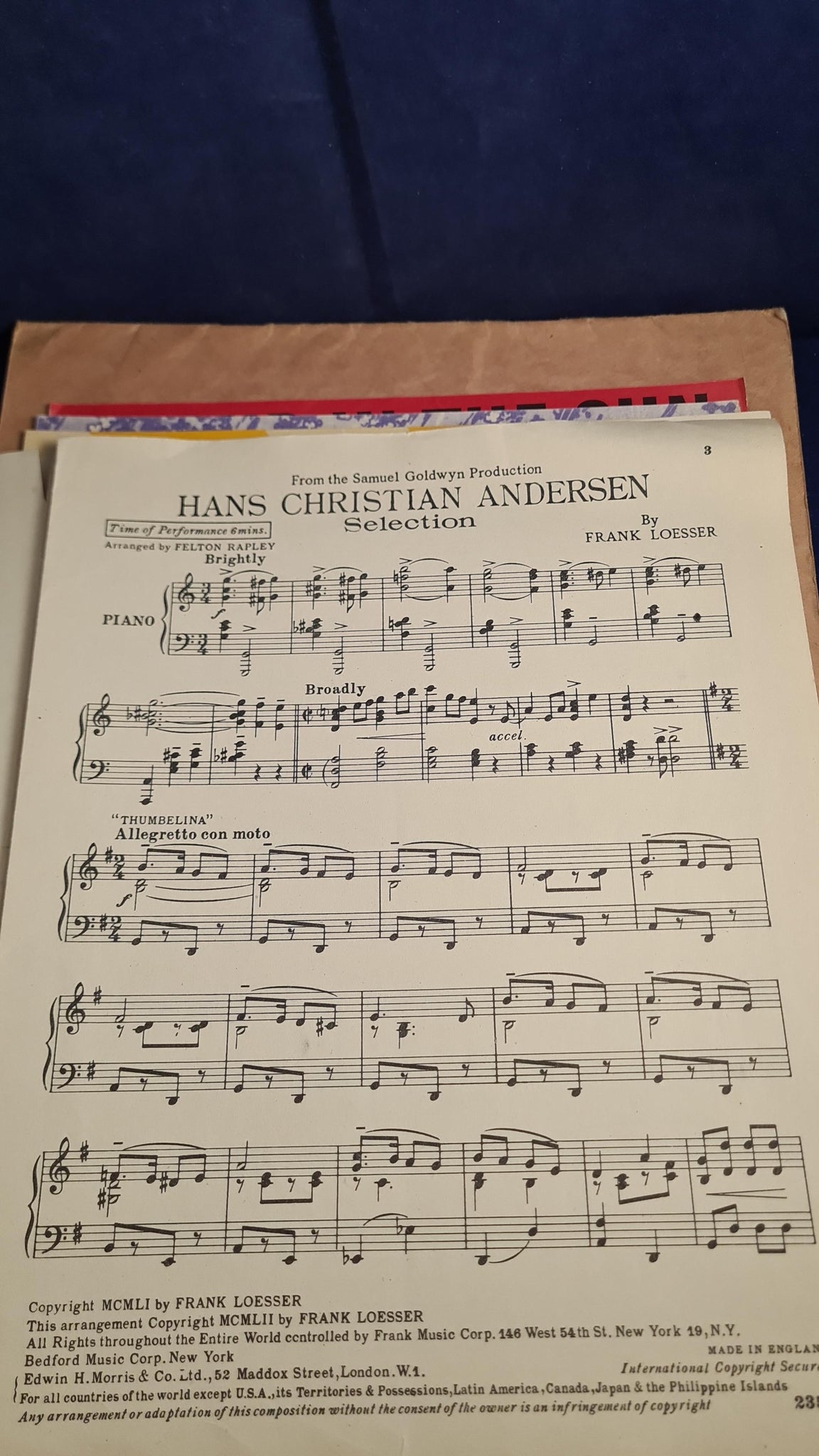 From Samuel Goldwyn;s new musical Wonderfilm Starring Danny Kaye - Hans Christian Andersen. The Very First Duets for the Pianoforte by Susan Forde. First Piano Lessons, Scenes At A Farm for beginners. Composer Frederick Rosse. Scales and Broken chords for Grade 1 Pianoforte. Four Indian Love Lyrics arranged for the Pianoforte by Composer Amy Woodforde-Finden (1913)- and signed on title page.