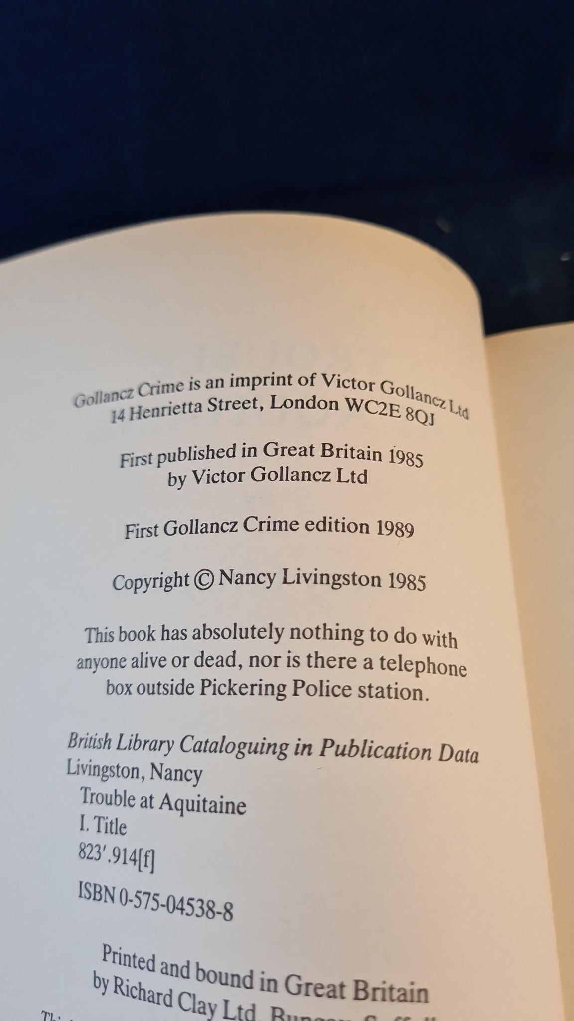 Nancy Livingston - Trouble at Aquitaine, Gollancz Crime, 1989, Paperbacks